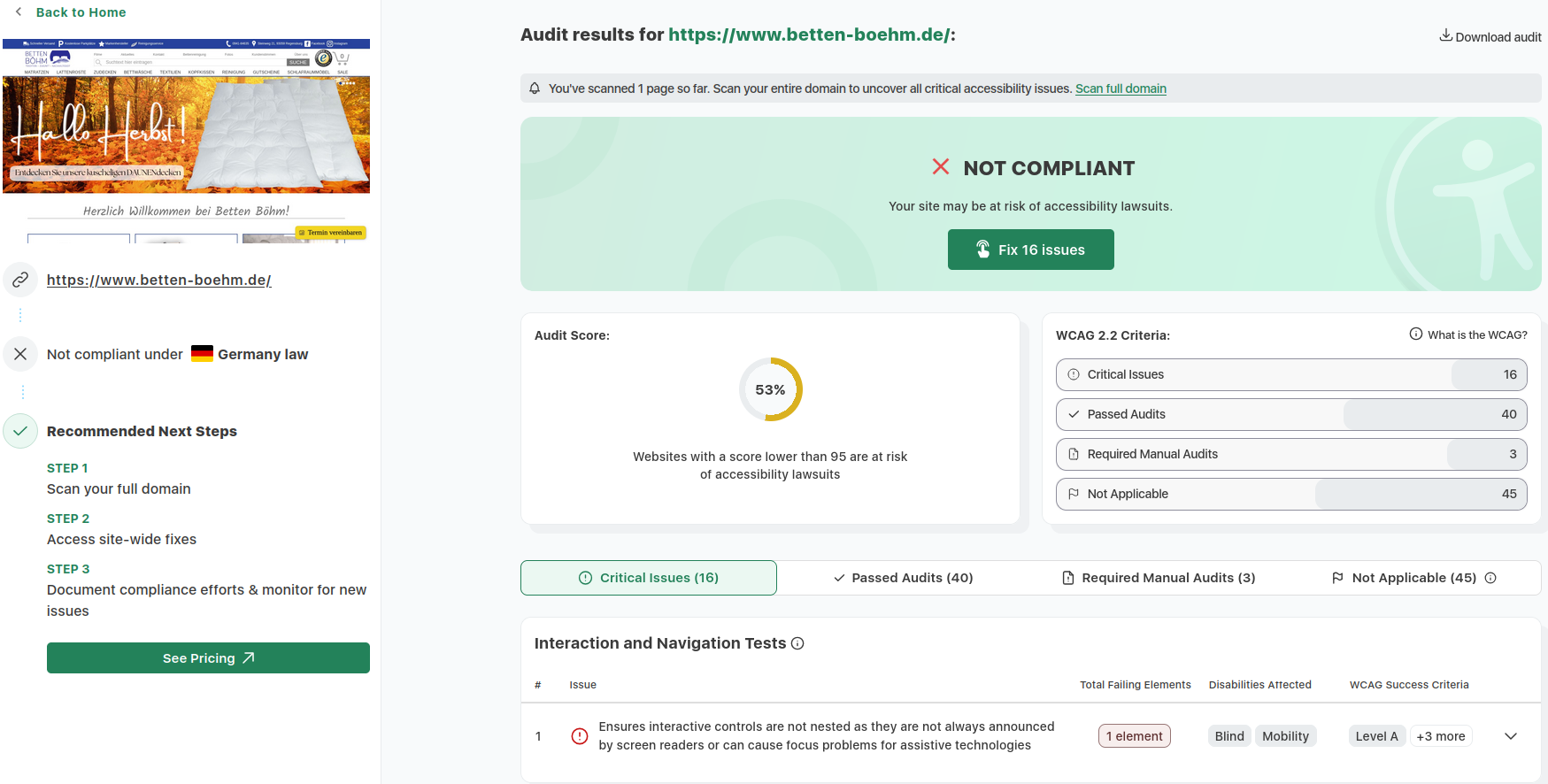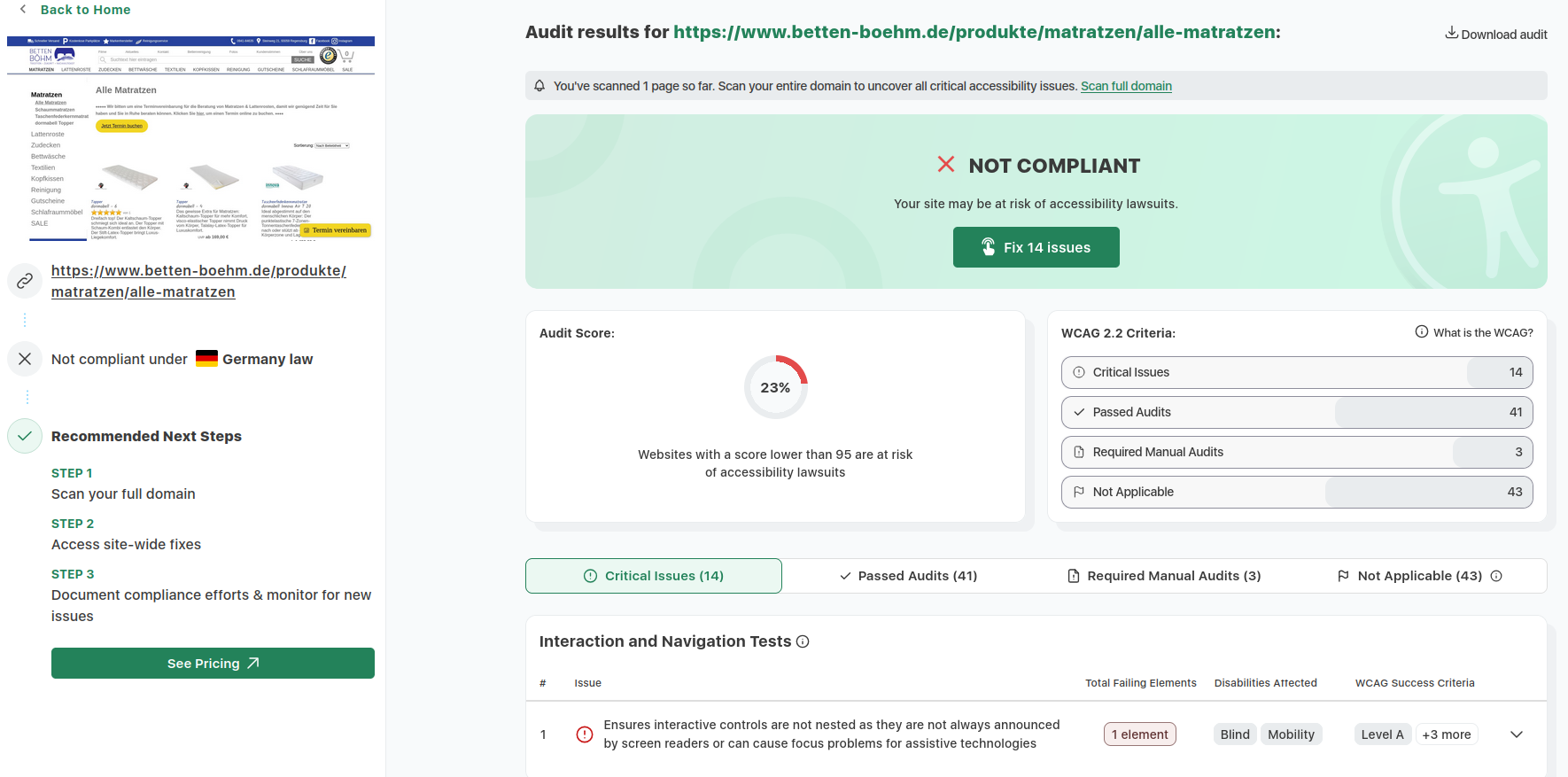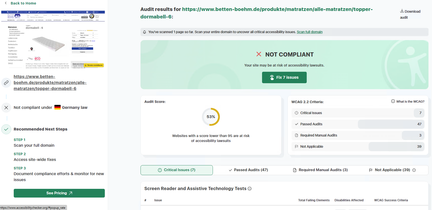 Zur Veranschaulichung unserer kontinuierlichen Überprüfungen der Barrierefreiheit haben wir Ergebnisse aus dem etablierten Tool accessibilitychecker.org dokumentiert. Diese Screenshots illustrieren exemplarisch identifizierte Barrieren sowie die erzielten Fortschritte. Im Folgenden finden Sie drei ausgewählte Screenshots solcher Prüfungen: